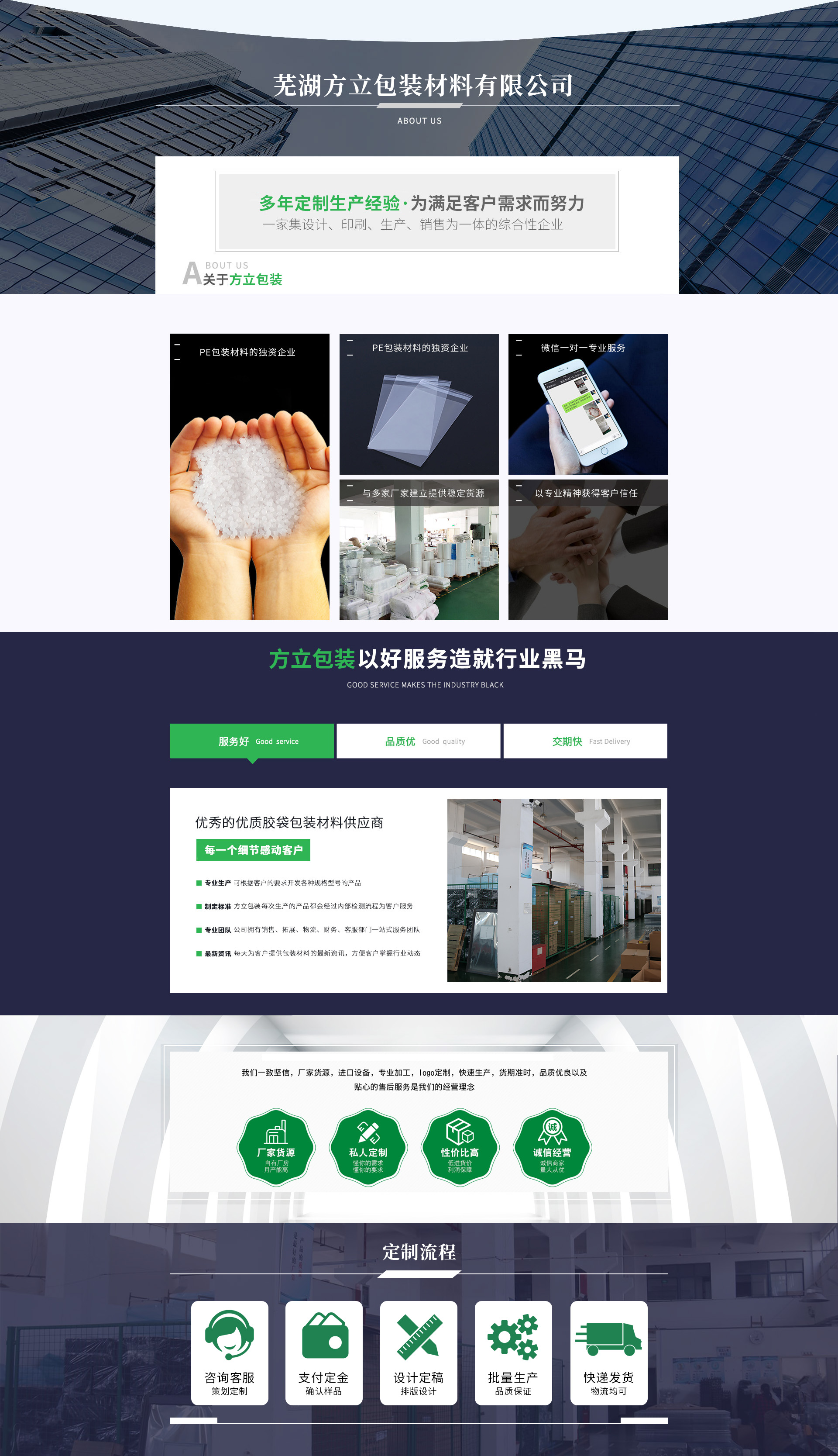 蕪湖方立包裝材料有限公司是一家生產包裝產品的企業,多年來一直致力于汽車配件、電子電器、化妝品、食品、工藝品、玩具、日用品、文體用品、五金工具等行業的包裝產品研發、定制、生產、服務。產品類型包括各類材質的吸塑包裝、EPE珍珠棉包裝、紙質包裝、PE拉伸膜、PE袋、氣泡袋、塑膠制品等包裝產品。產品銷往國內多個城市,深受客戶好評。公司現有多臺生產設備及過硬的技術人員團隊為廣大客戶提供優良的產品和完善的服務。公司始終以“質量...